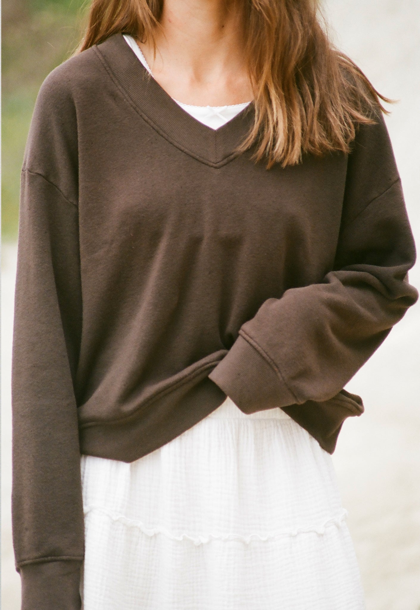 A perfectly cropped and slightly oversized v-neck sweatshirt, made of the softest cotton modal blended fleece. Accented with a chunky ribbed trim. Due to the enzyme wash, please allow for some subtle variations in the finish - this is an intentional part of the garment.