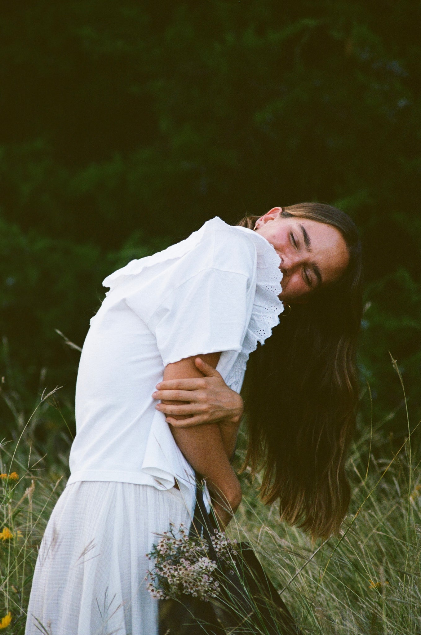 The Cottage Tee features a relaxed easygoing fit and a deep V neckline trimmed with an embroidered ruffle. Sleeves are finished with a delicate merrow edge. Slightly cropped to pair perfectly with your favorite jeans.